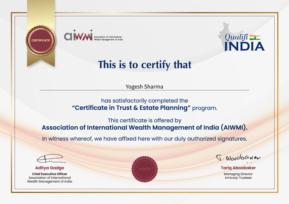 Yogesh Sharma undertook a certification program in Trust and Estate Planning offered by AIWMI.